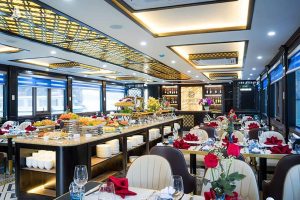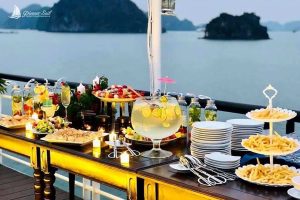 4:00 PM: Return to the cruise and prepare for the Sunset Party. Enjoy Vietnamese tea, fresh fruits, and snacks while relaxing on the sundeck or in the Jacuzzi. The cruise will pass by Hoa Cuong, one of the most beautiful spots in the bay, on the way back.