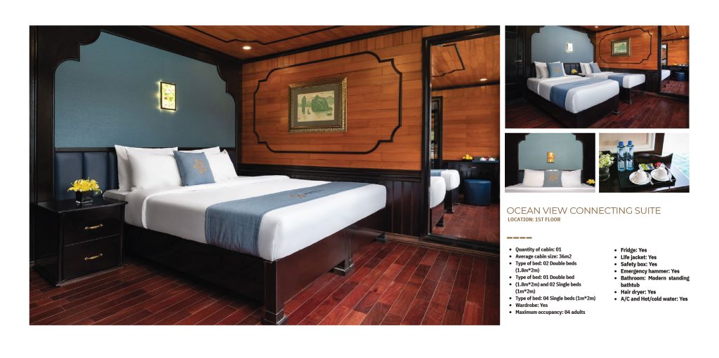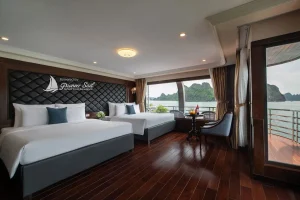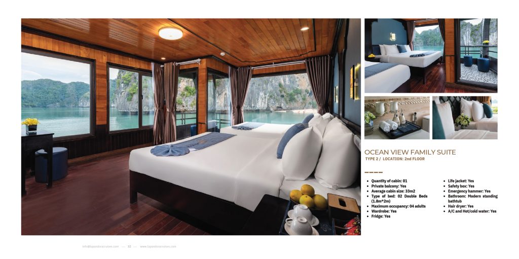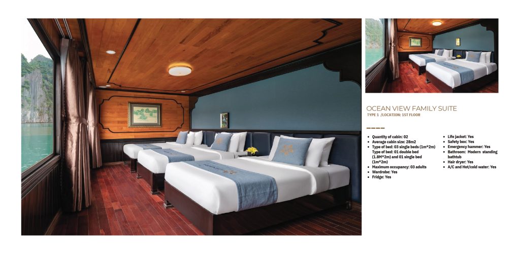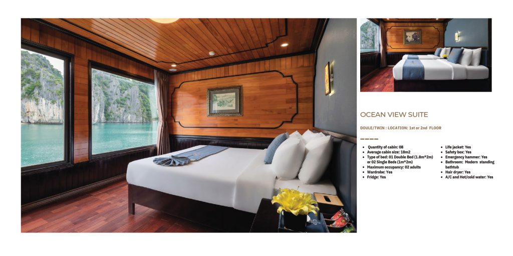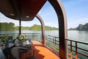 • 15:30: The cruise sails through Lan Ha Bay. The area is surrounding of extraordinary limestone karsts landscapes. We progress to Ong Cam Area of Lan Ha Bay- a separate part of Ha Long Bay. This is a quiet tourist paradise in Vietnam, enjoy kayaking and/or enjoy swimming in the crystal-clear waters of the Bay.